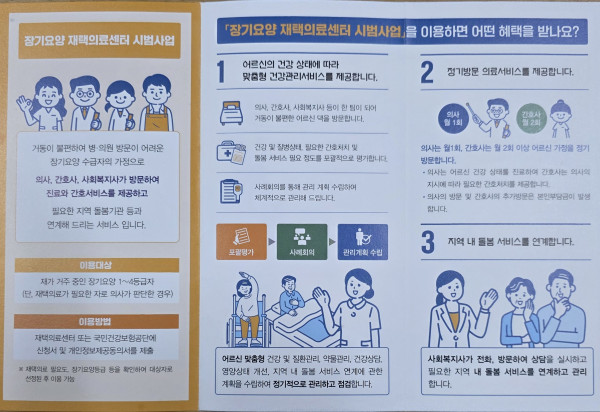 장기요양 재택의료센터 시범사업 페이지 정보 작성자최고관리자 댓글 0건 조회 70회 작성일 25-09-12 19:19 본문 재택의료 시범사업어르신 댁으로 의사와 간호사가 찾아갑니다. 목록 답변 이전글산정특례제도 "자주 묻는 질문 TOP 7" 25.09.12 다음글식사의 즐거움, 행복한 노년 25.04.09 댓글목록 댓글목록 등록된 댓글이 없습니다.