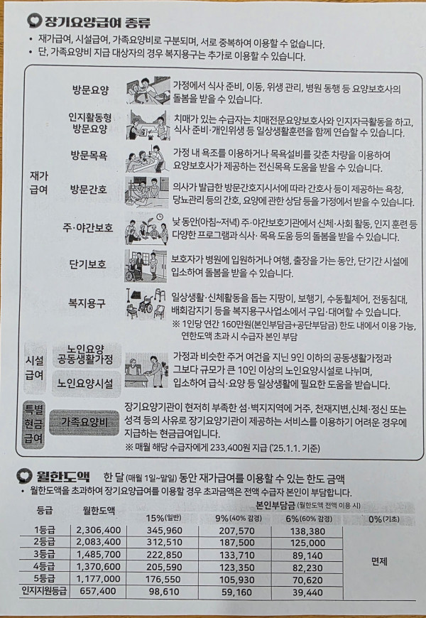 장기요양급여종류와 월한도액 페이지 정보 작성자최고관리자 댓글 0건 조회 76회 작성일 25-09-14 21:19 본문 장기요양급여종류와 2025년 월한도액 목록 답변 이전글건강습관! 올리GO 대사증후군! 잡GO 25.09.14 다음글치매예방수칙 3.3.3 25.09.12 댓글목록 댓글목록 등록된 댓글이 없습니다.